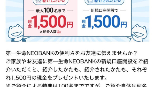 キャッシュバック 第一生命NEOBANK 新規口座開設で2000円!+最大50000円! 2026年4月18日 takayoshi1 しのぎブログ ■ 提供者 匿名希望様 ■ 提供内容:第一生命NEOBANK 新規口座開設で2000円!+最大50000円!!のご紹介! 新規 …