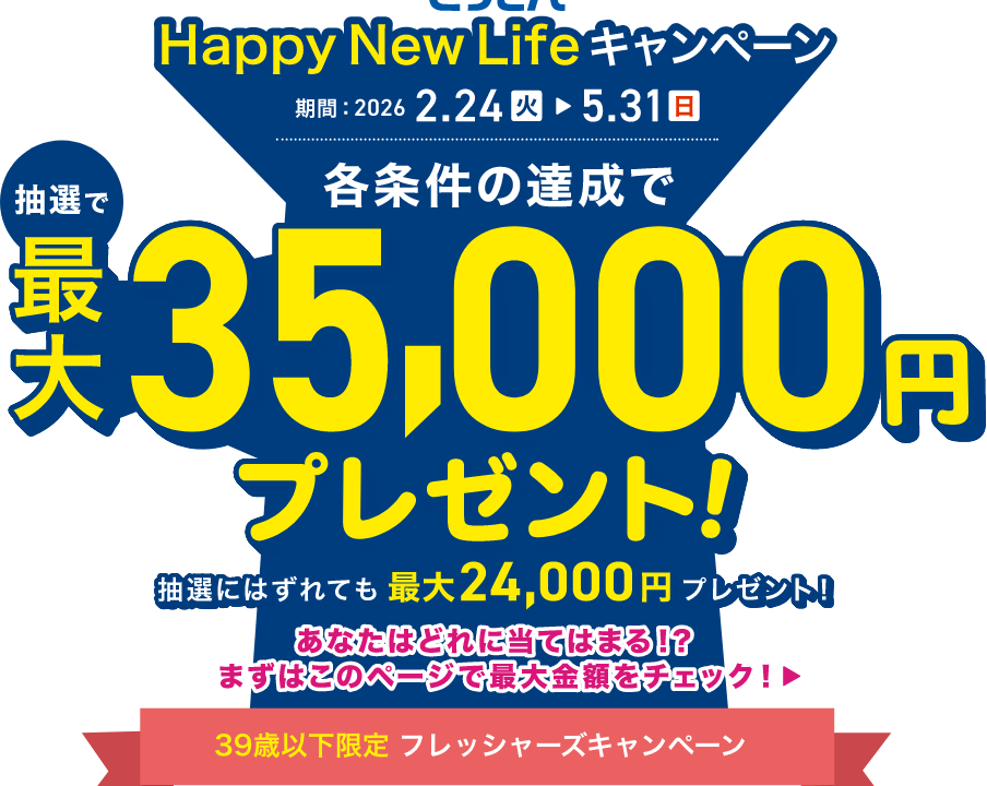 39歳以下が対象で、給与振込として2026年6月中に3万円以上の振込があると、