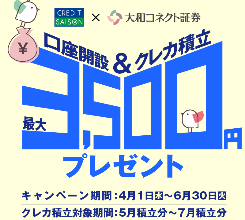 ■ 提供内容:大和コネクト証券にセゾン・UCカードで口座開設&クレカ積立2万円以上で、最大3,500円をGET!